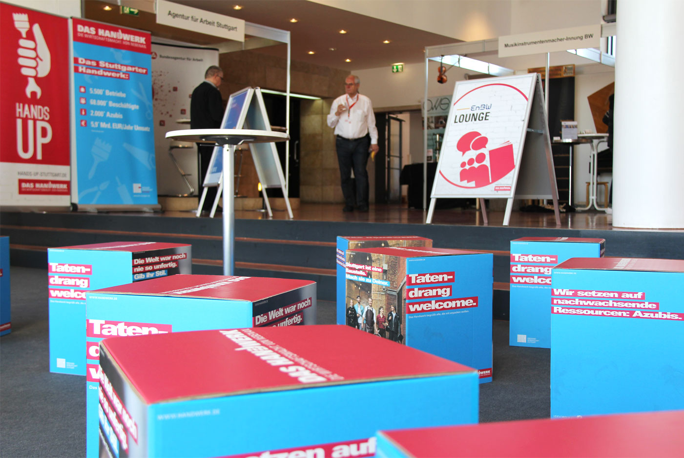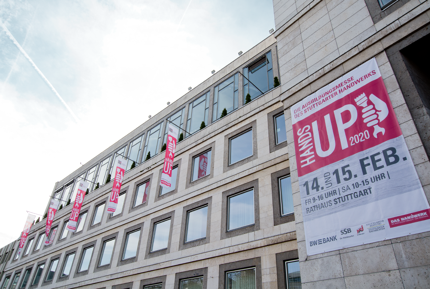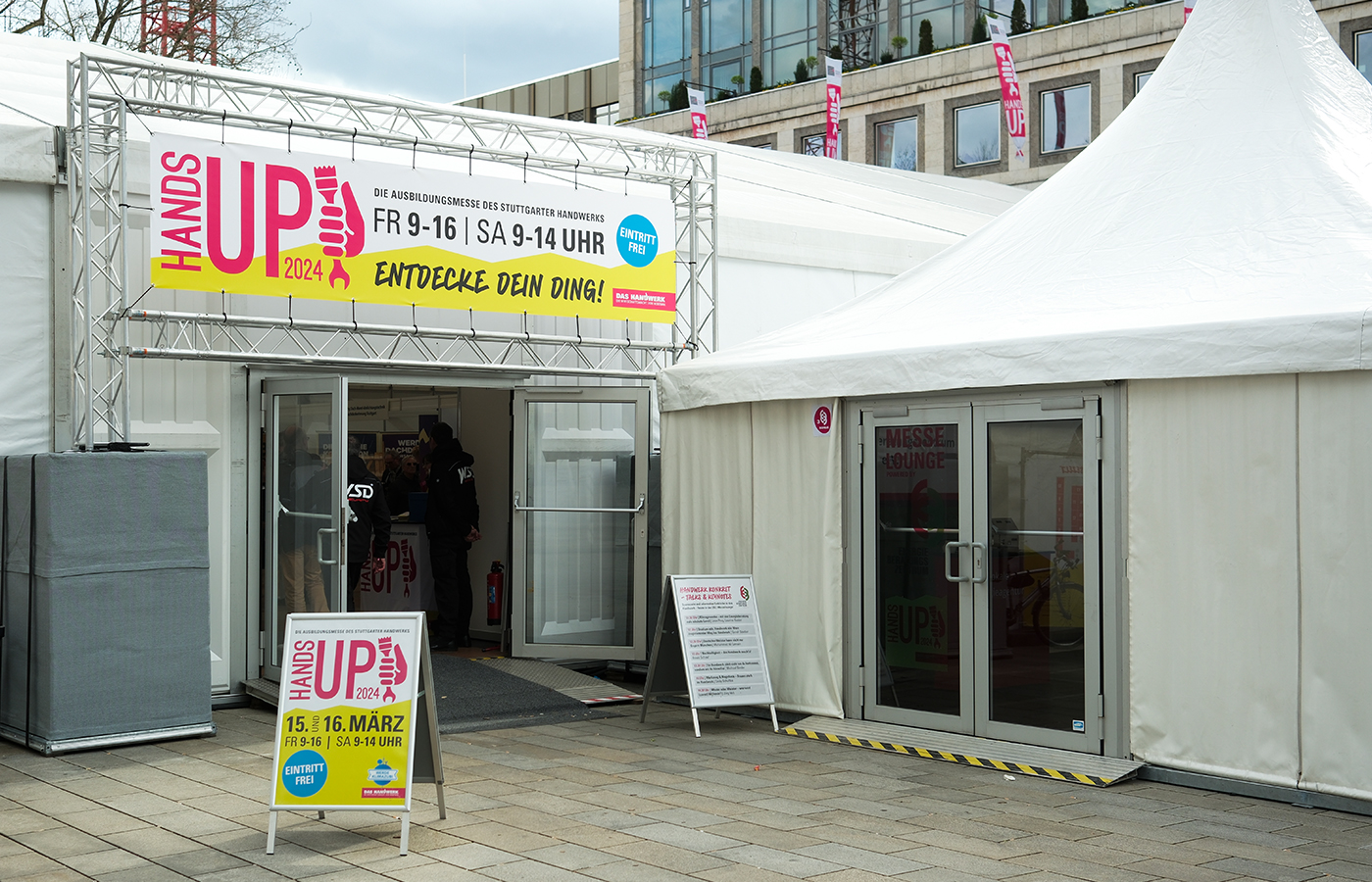 Jung, modern, spannend – so präsentierte sich das Handwerk an 2 Messetagen seinen Besuchern. Vom Grundkonzept, der Messevorbereitung, der Veranstaltungsdurchführung bis zur Nachbereitung legen wir dabei Hand an. Seit 2022 findet die HANDS UP prominent im großen Messezelt auf dem Stuttgarter Marktplatz statt. 2024 konnten wir bereits 10-jähriges Jubiläum mit zahlreichen Ehrengästen feiern.