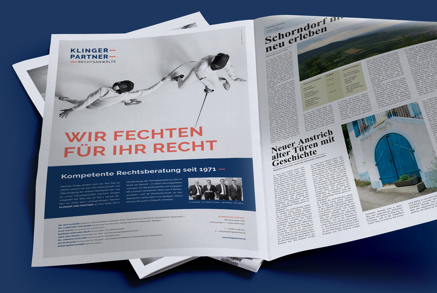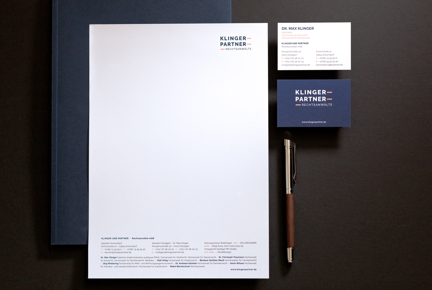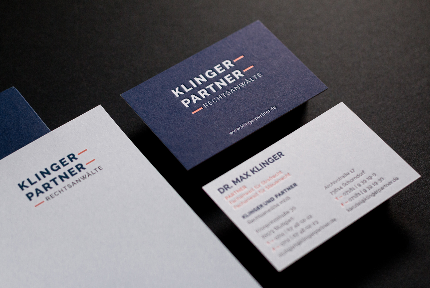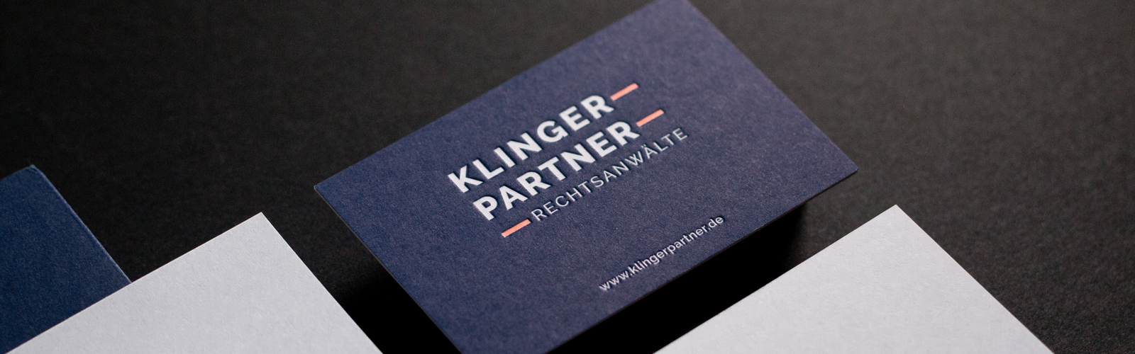 Unter dem Claim »Wir fechten für Ihr Recht« positioniert sich KLINGER UND PARTNER zukünftig selbstbewusst und mit Leidenschaft als moderne Rechtsanwaltskanzlei. Das neue Corporate Design besticht durch Understatement und schlichte Eleganz. Das neue Logo besteht aus einer Versalien-Wortmarke in einer klaren serifenlosen Typografie und geviertlangen Spiegelstrichen, die ausgleichend, verbindend und richtungsgebend wirken. Die Farbwelt vermittelt mit einem tiefen Ozeanblau Vertrauen und setzt mit einem leuchtenden Koralleton dynamische Akzente. Eine mutige Bildsprache mit ausdruckstarken Motiven der Fechtwelt vermittelt das besondere Narrativ der Kanzlei, transportiert Werte und Emotionen und sorgt für Aufmerksamkeit, Wiedererkennung und eindeutige Unterscheidbarkeit im Paragraphendschungel der Mitbewerber.